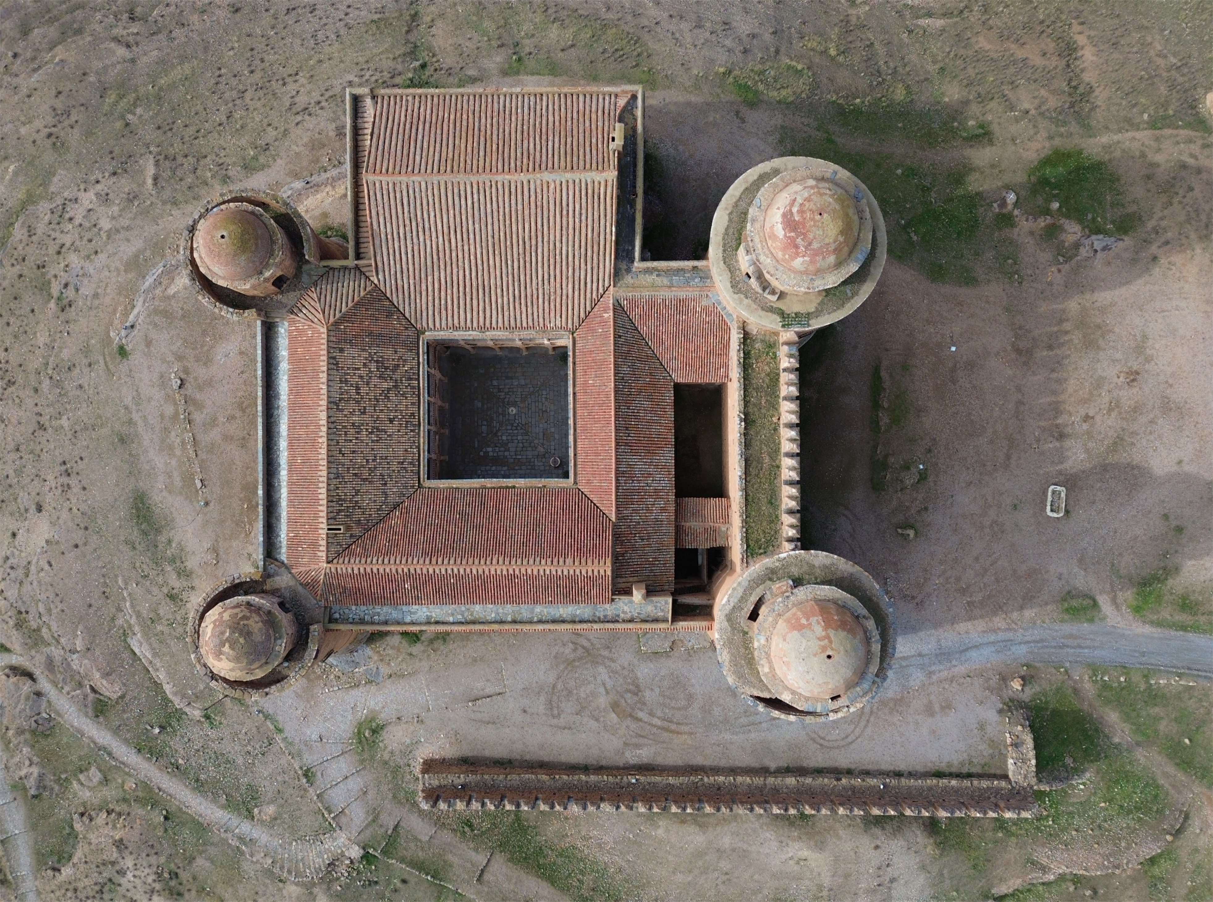 Exteriormente se muestra como una fortaleza de planta rectangular con unas dimensiones aproximadas 46,50 metros de largo por 32 metros de ancho, con una orientación predominante de sus lados mayores hacia el eje Norte-Sur. Los muros superan los 3 metros de espesor y están construidos con sillería de piedra. En cada esquina se sitúa una torre circular rematada por una cúpula. Las del muro sur tienen un diámetro de 10 metros, mientras que las del norte alcanzan los 13 metros. En la fachada occidental sobresale una estructura rectangular de 26 por 16 metros.