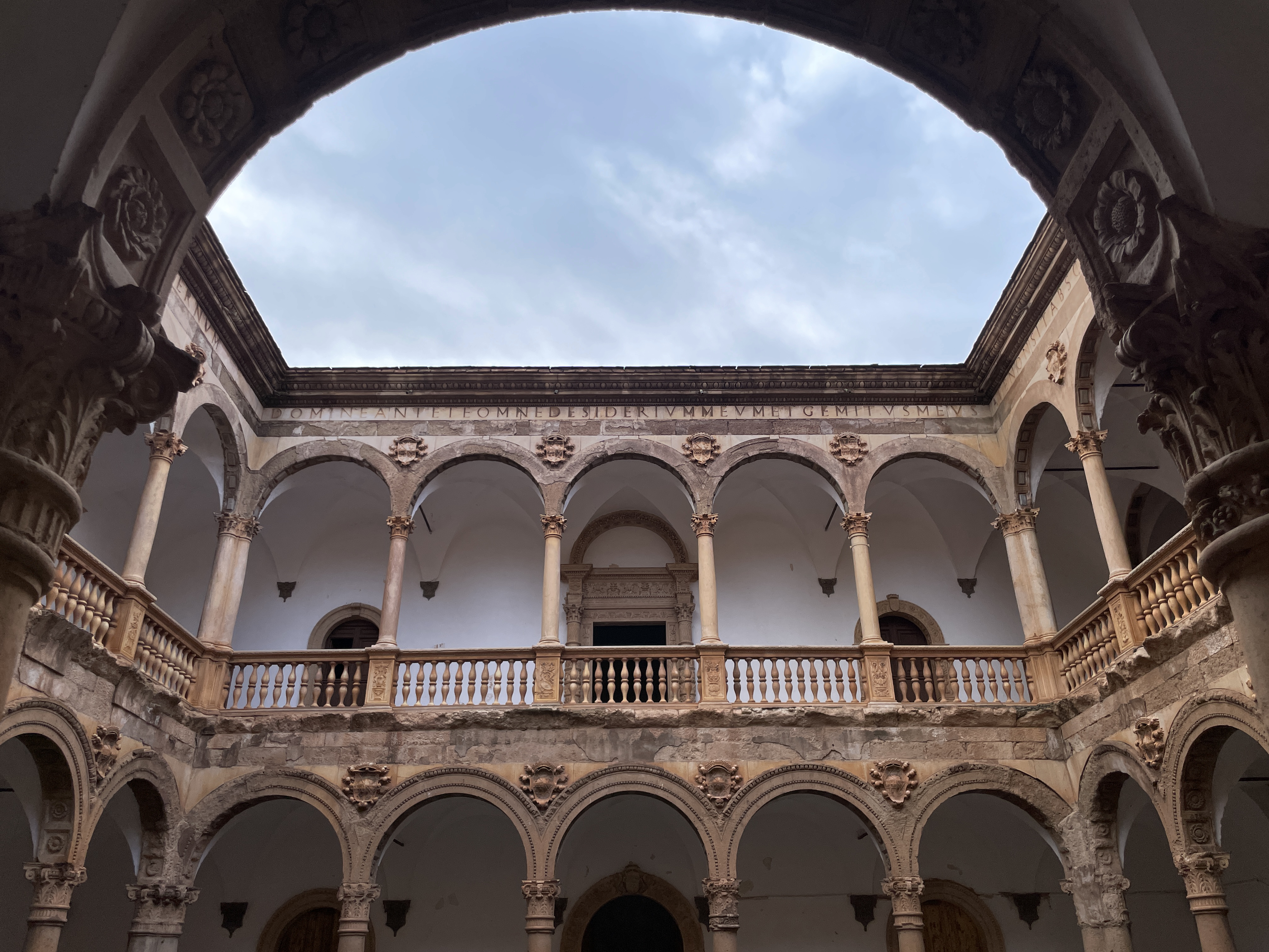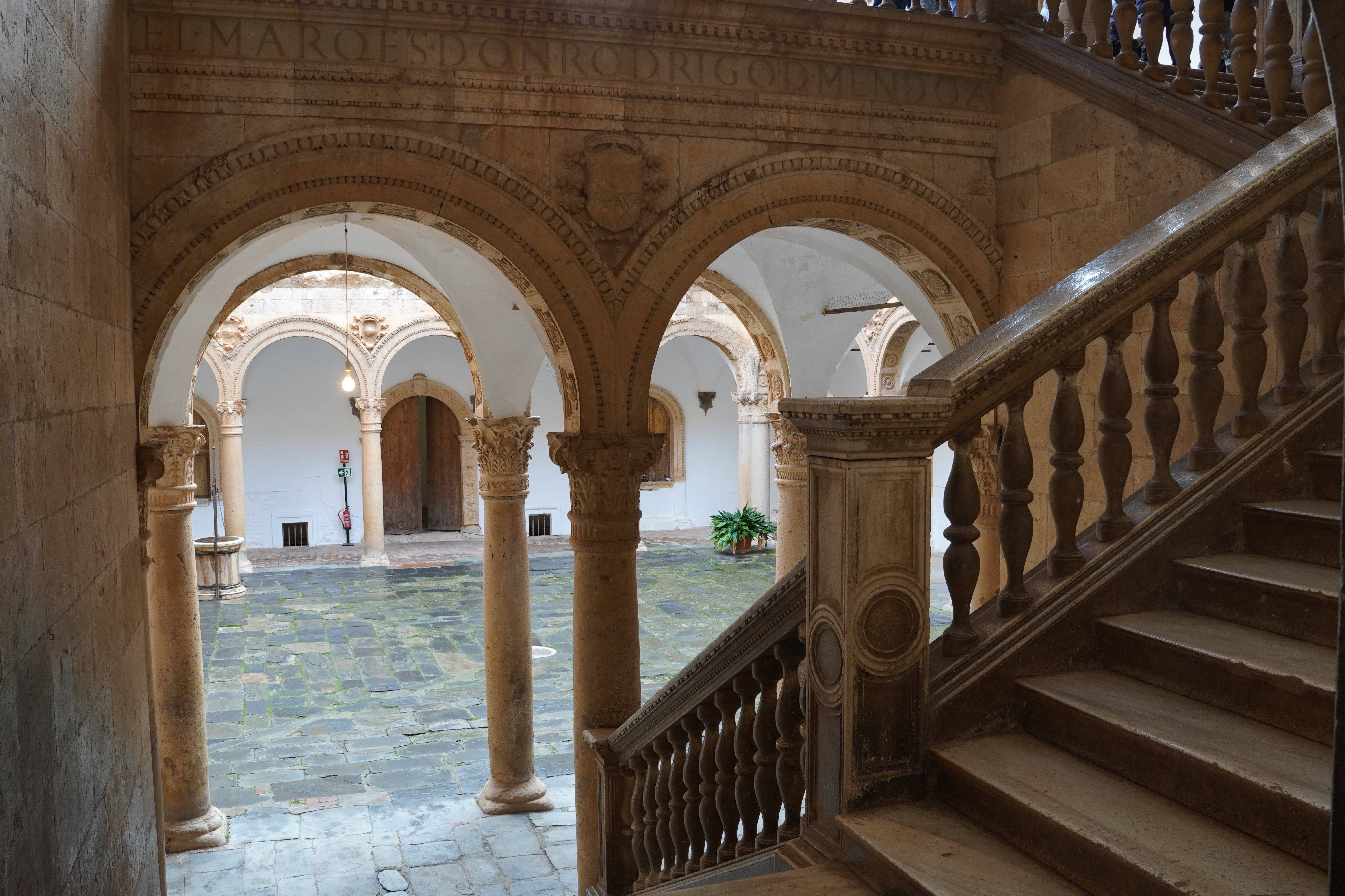 En el interior del edificio encontramos un patio cuadrado de 20 metros de lado, que rompe con la sobriedad externa. El patio, un cortile rinascimentale, es el centro del edificio y consta de dos plantas con arcadas superpuestas (cinco huecos por lado). La planta baja está realizada con piedra caliza local, mientras que la superior es íntegramente mármol de Carrara. Las galerías se cubren con bóvedas de aristas de mampostería, que se sustentan gracias a unas tirantas de hierro, una muestra más de la influencia italiana en el edificio.